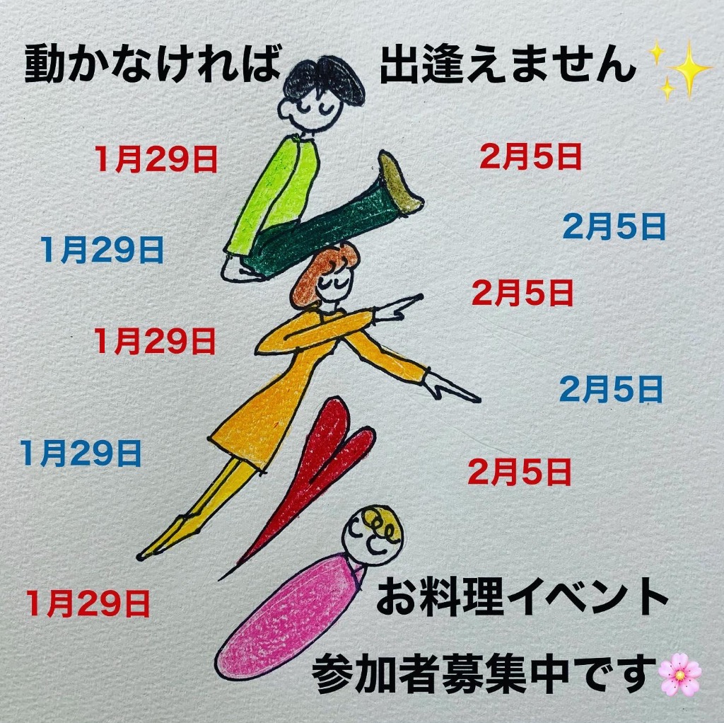 自己紹介▶料理教室(1品毎にグループ交代)▶食事▶片付け▶︎気になるお相手の番号記入